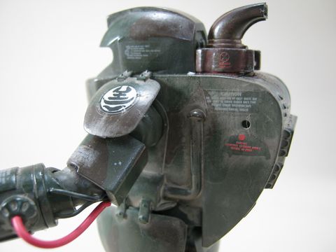 崩した字体で右肩シールドに「悪」左肩シールドには「善」の文字がマーキングされています。上半身はガンダムマーカーのウエザリングマーカーでウォッシングした形になっちゃいました。インクを出そうとペン先を押し付けたらドバっと出ちゃって…(<下手)。田宮のアクリルカラー溶剤でふき取りましたがあまり綺麗に汚れていません。